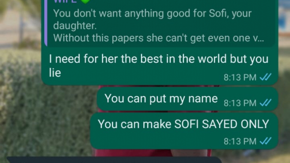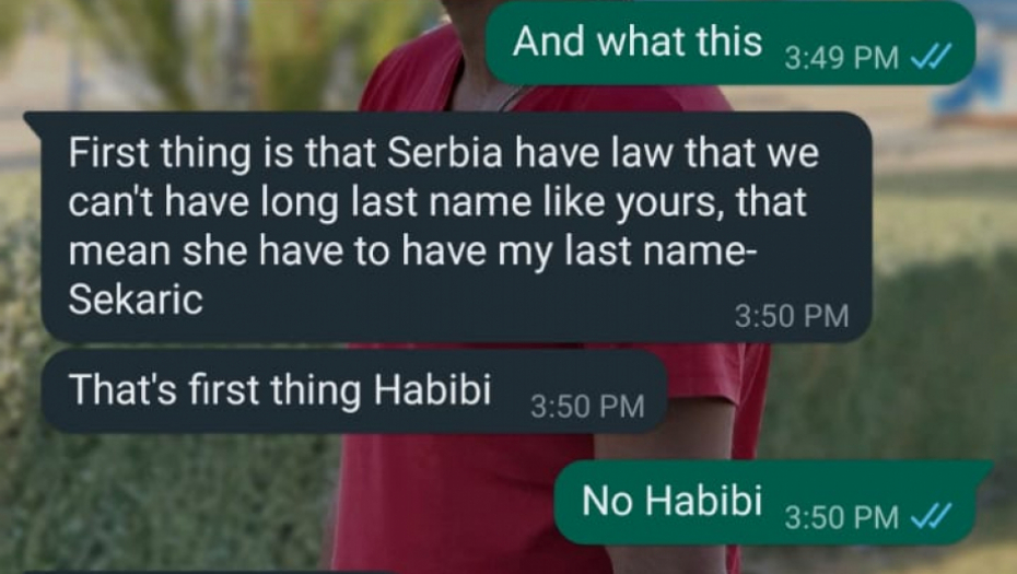 - Ne mogu joj srediti papire sa tvojim imenom jer ti je prezime predugačko, a prema našem zakonu ne smeš imati četiri prezimena, već samo jedno i zbog toga to mora biti prezime njene majke. Moraš mi dati starateljstvo da bih je vakcinisala - stoji u prepiskama koje nam je dostavio Sajed.