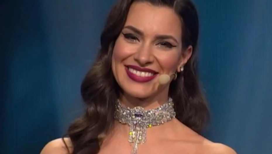 Posebnu pažnju privukla je raskošna ogrlica koju je nosila oko vrata, dok je kosu pustila da joj pada preko ramena, a pored nje na bini bio je i voditelj Jovan Radomir.