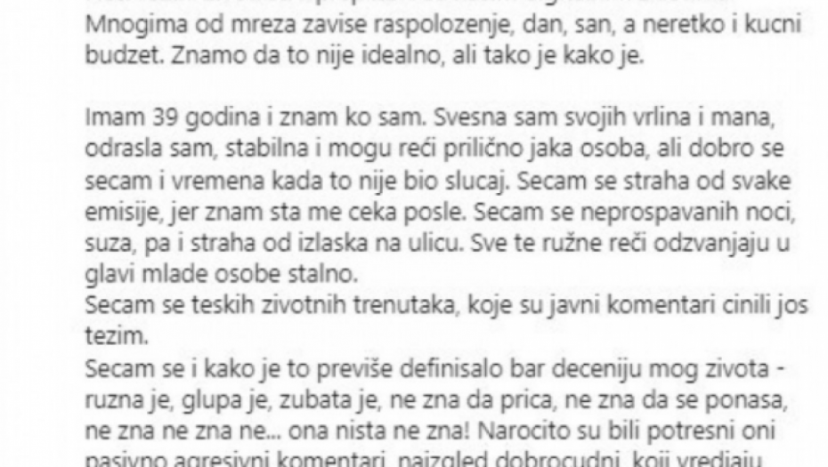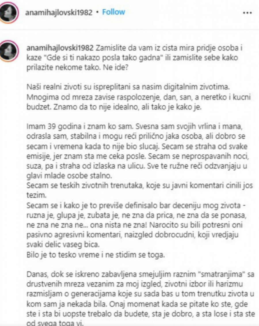 - Imam 39 godina i znam ko sam. Svesna sam svojih vrlina i mana, odrasla sam, stabilna i mogu reći prilično jaka osoba, ali dobro se sećam i vremena kada to nije bio slučaj. Sećam se straha od svake emisije, jer znam šta me čeka posle. Sećam se neprospavanih noći, suza, pa i straha od izlaska na ulicu. Sve te ružne reči odzvanjaju u glavi mlade osobe stalno. Sećam se teških životnih trenutaka, koje su javni komentari činili jos težim - piše Ana i otkriva kako je reagovala na negativne komentare sa kojima se susretala: