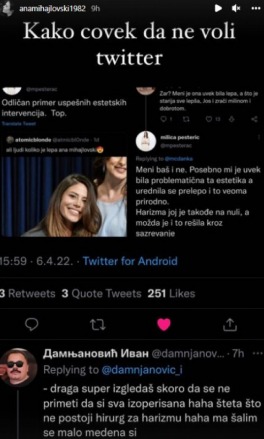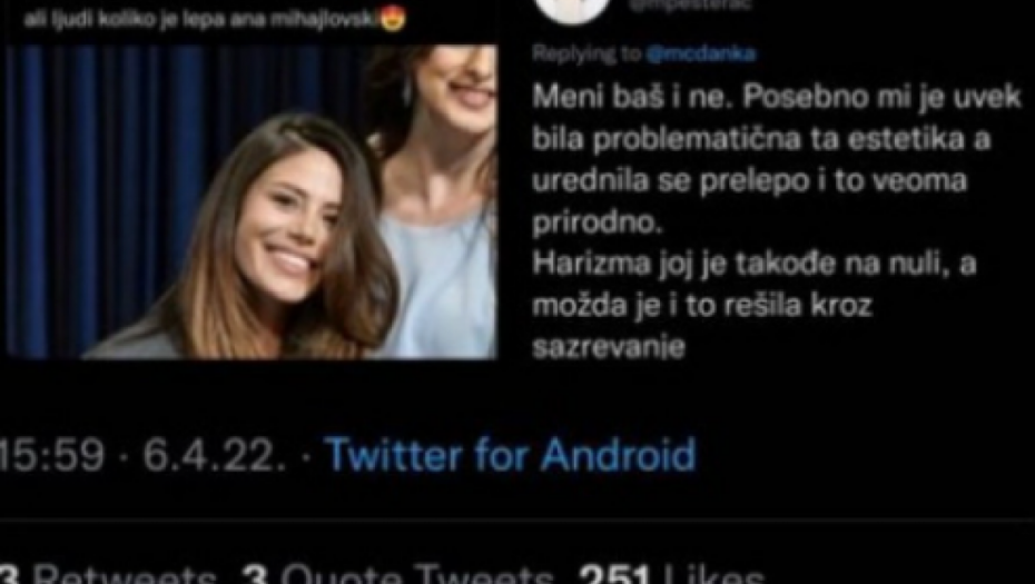 Voditeljka Ana Mihajlovski postala je meta korisnika Tvitera zbog svog izgleda. Kako je dugo nije bilo u medijima, njeno nedavno pojavljivanje izazvalo je veliko pažnju. Umesto komplimenata na njen račun, stizale su samo uvrede. Najpre kako je izoperisana, a potom i da joj je harizma „nula”.