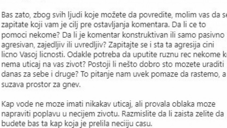 - Baš zato, zbog svih ljudi koje možete da povredite, molim vas da se zapitate koji vam je cilj pre ostavljanja komentara. Da li će to pomoći nekome? Da li je komentar konstruktivan ili samo pasivno agresivan, zajedljiv ili uvredljiv? Zapitajte se i šta ta agresija čini lično vašoj ličnosti. Odakle potreba da uputite ružnu reč nekome ko nema uticaj na vaš život? Postoji li nešto dobro što mozete uraditi danas za sebe i druge? To pitanje nam uvek pomaže da rastemo, a i sužava prostor za gnev - kaže voditeljka i dodaje: