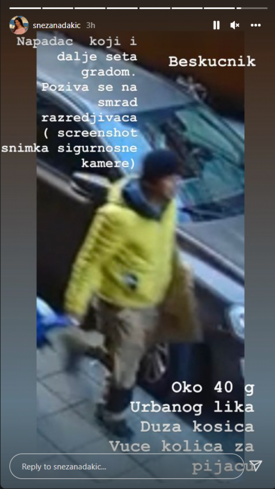 Snežana je tada objasnila da ju je napao nepoznati čovek jer mu je smetao njen parfem. Sada je Dakićeva objasnila o čemu se radi na svom Instagram nalogu, a objavila je i fotografiju svog napadača, koje su zabeležile sigurnosne kamere.