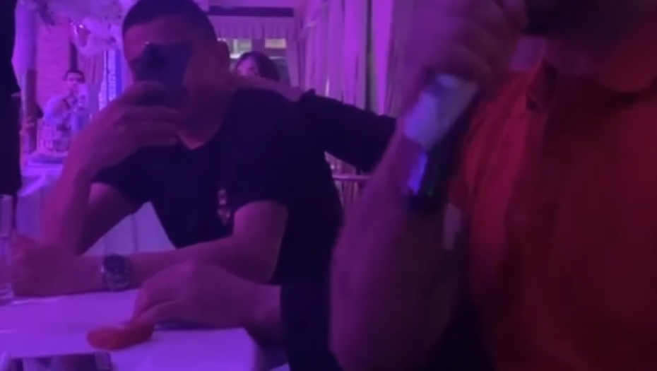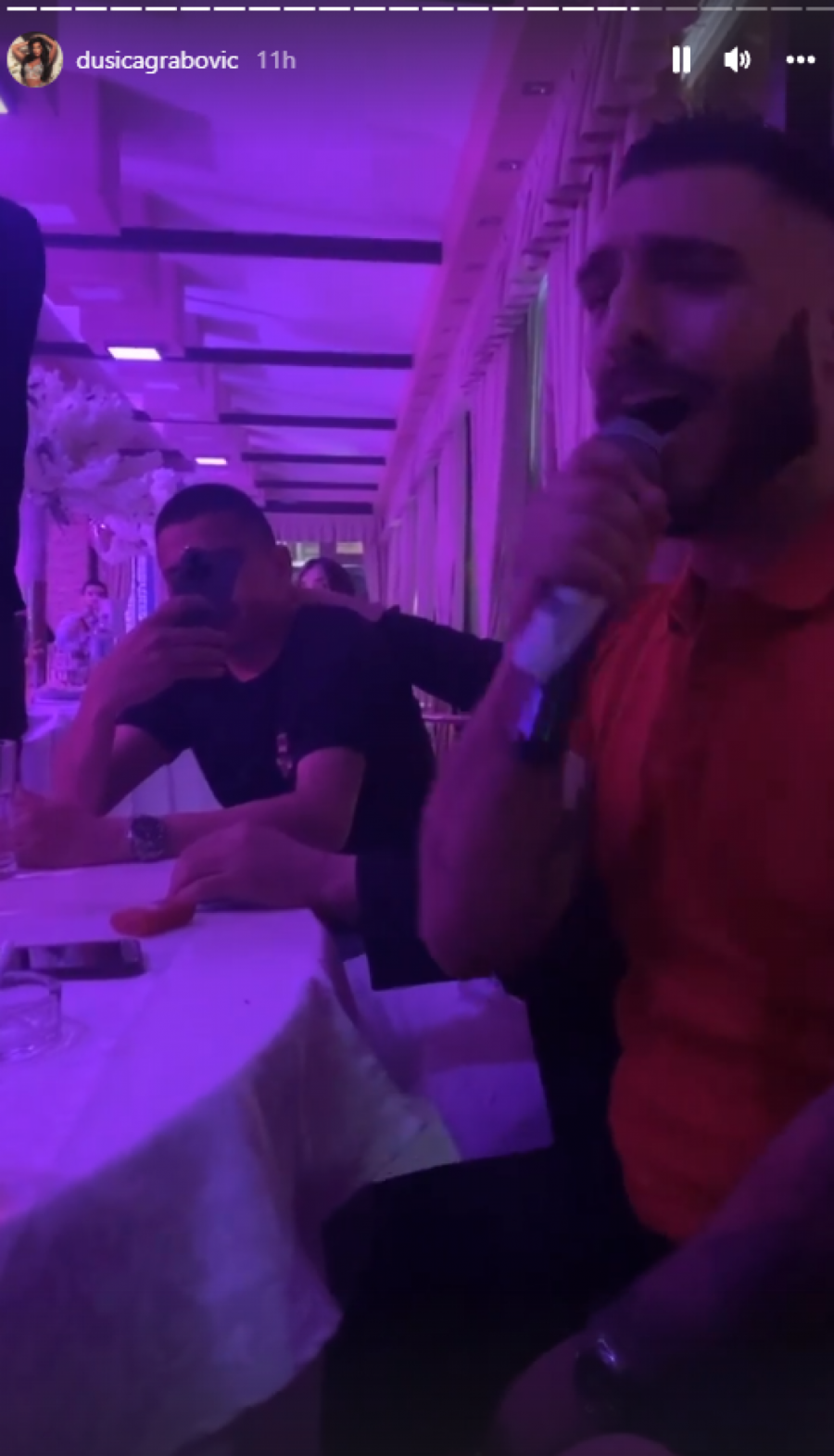 Pevač je čak uzeo i mikrofon u ruke i zapevao, a za njegovim stolom bila je i pevačica Dušica Grabović,koja je nedavno dovođena u vezu sa organizovanom prostitucijom zajedno sa Duškom Banjcem.