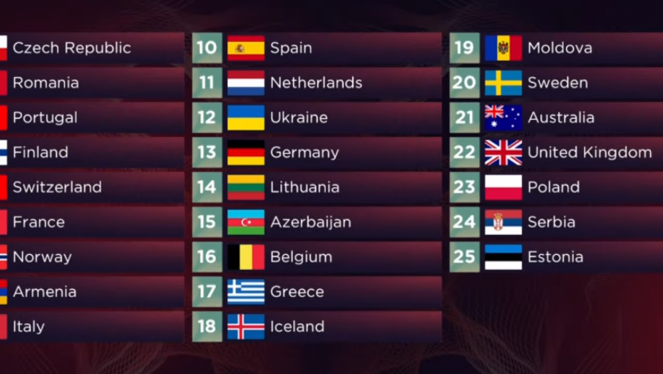 Ovo je redosled zemalja koje nastupaju večeras, a Konstrakta nastupa pod rednim brojem 24.