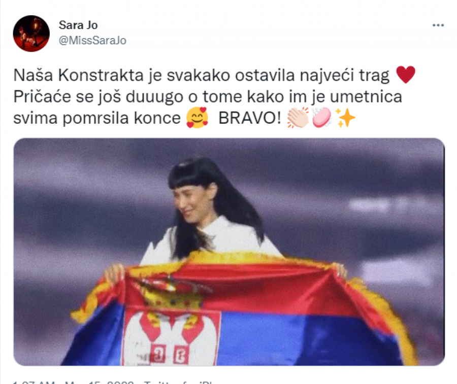 Podsetimo, preključe je održano finale popularnog takmičenja Evrovizija 2022 u Torinu, na kojem je Ukrajina odnela pobedu. Konstrakta je na pomenutom takmičenju zauzela visoko 5. mesto, a iznad nje bile su Ukrajina, Velika Britanija, Španija i Švedska.