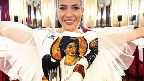 Jovana se, dakle, obukla sva u belo, dok je na grudima imala naslikanog Belog anđela, a na rukama ima karnere koji podsećaju na krila. Raširila je ruke i sa osmehom pozirala.