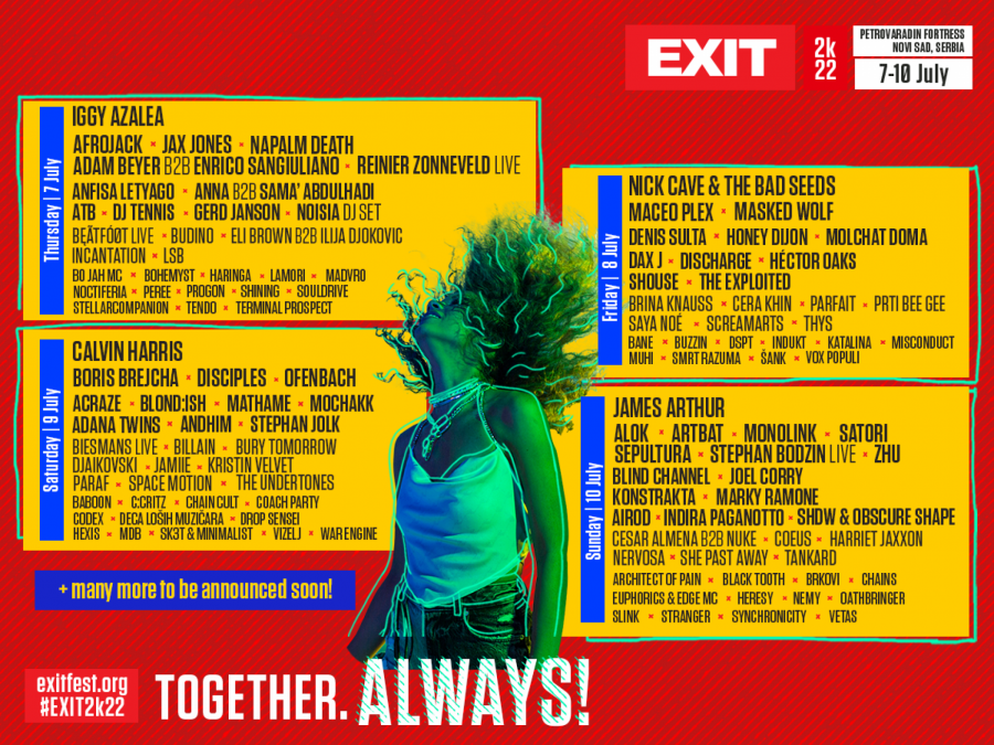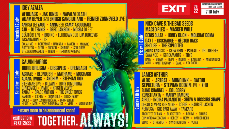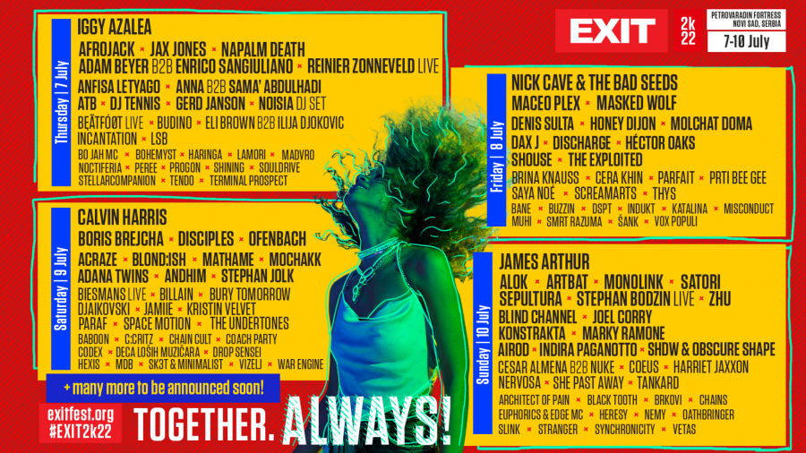 Od 7. do 10. jula Petrovaradinska tvrđava će na svojih će 40 bina i zona biti savršena pozornica za globalne megahitove i muzičke himne koje su (re)definirale žanrove. Veliki i moćni Calvin Harris i Nick Cave & The Bad Seeds, rep superzvezda Iggy Azalea, hitmejkeri i trendseteri James Arthur, Masked Wolf, Disciples, Ofenbach, Acraze, vodeća elektronska imena današnjice Maceo Plex, Boris Brejcha, ARTBAT, Honey Dijon, Afrojack, Alok, Zhu, Reinier Zonneveld, Anfisa Letyago, Denis Sulta, žestoki Napalm Death, Sepultura, Blind Channel, legendarni Marky Ramone i The Exploited, najtraženije ime regiona Konstrakta i mnogi drugi, kojima će se uskoro pridružiti još imena, kreiraće soundtrack festivalskog leta 2022. Kompletan program ovogodišnjeg izdanja biće zaokružen sledeće nedelje.