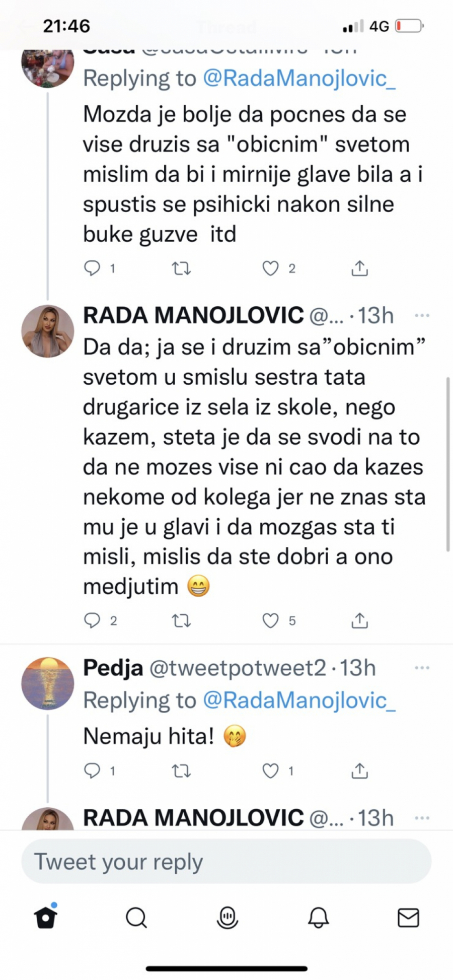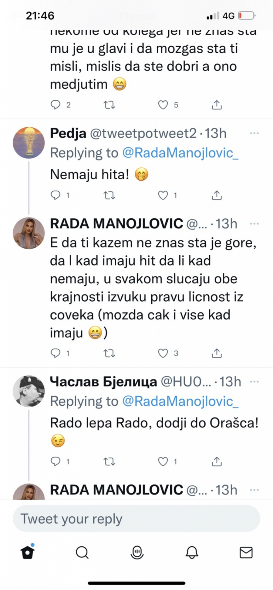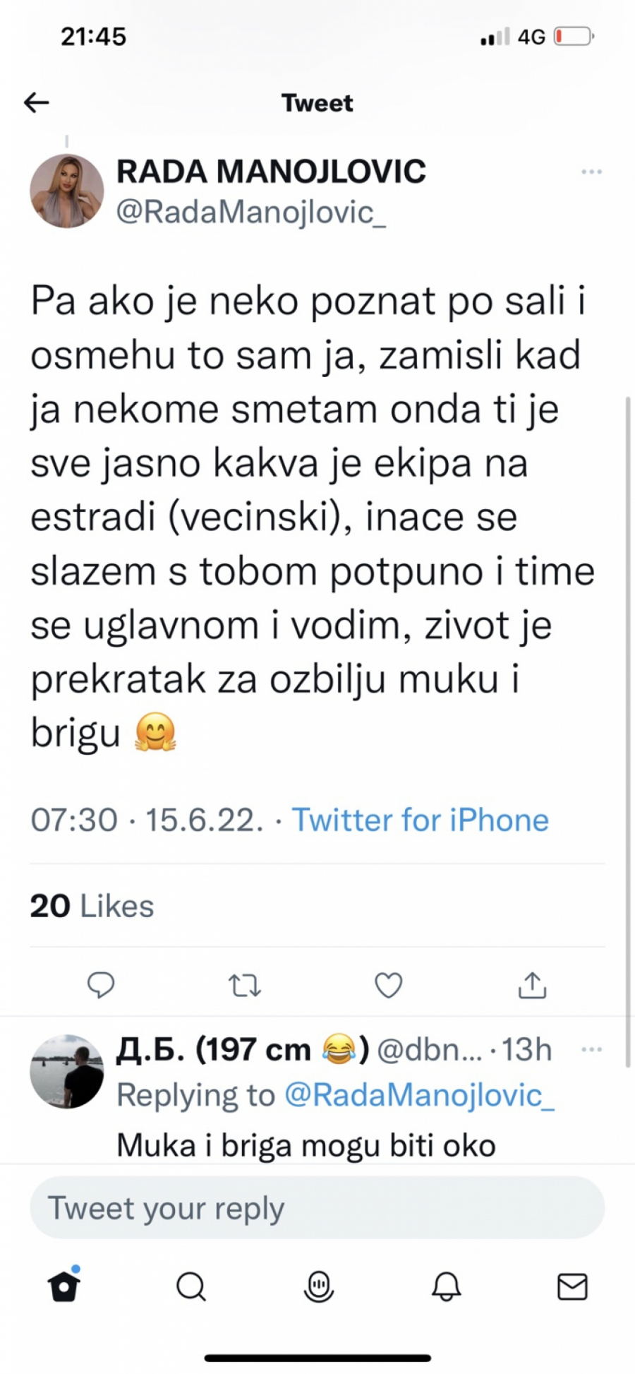 - Ako je neko poznat po šali i smehu to sam ja. Zamsli kada ja nekome smetam, onda je jasno kakva je većinski ekipa na estradi. Vodim se time da je život prekratak za ozbiljnu muku i brigu. Tviteraši su normalni ljudi, estrada je kompleks težak- šokirala je izjavom Rada.