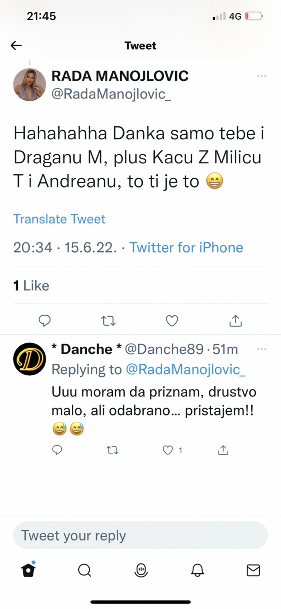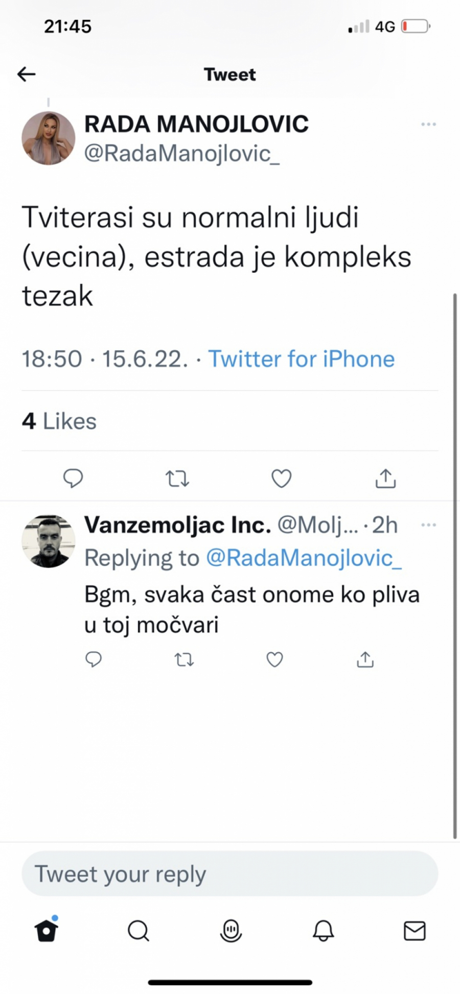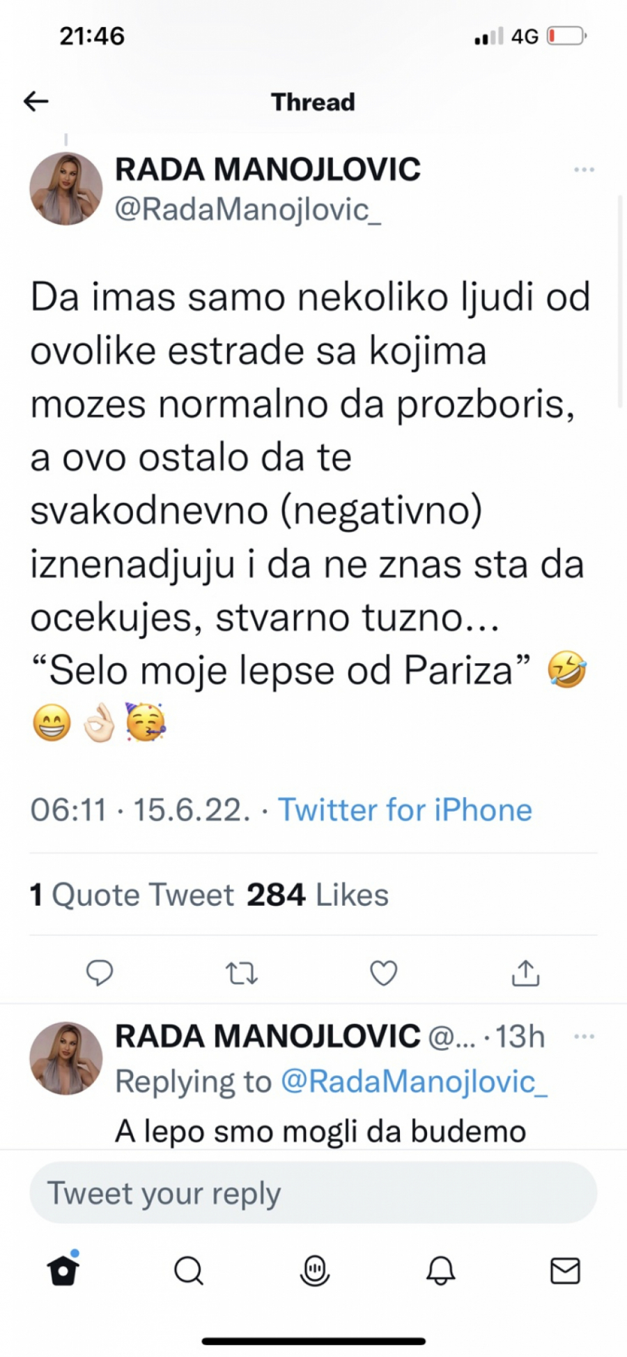 - Ako je neko poznat po šali i smehu to sam ja. Zamsli kada ja nekome smetam, onda je jasno kakva je većinski ekipa na estradi. Vodim se time da je život prekratak za ozbiljnu muku i brigu. Tviteraši su normalni ljudi, estrada je kompleks težak- šokirala je izjavom Rada.