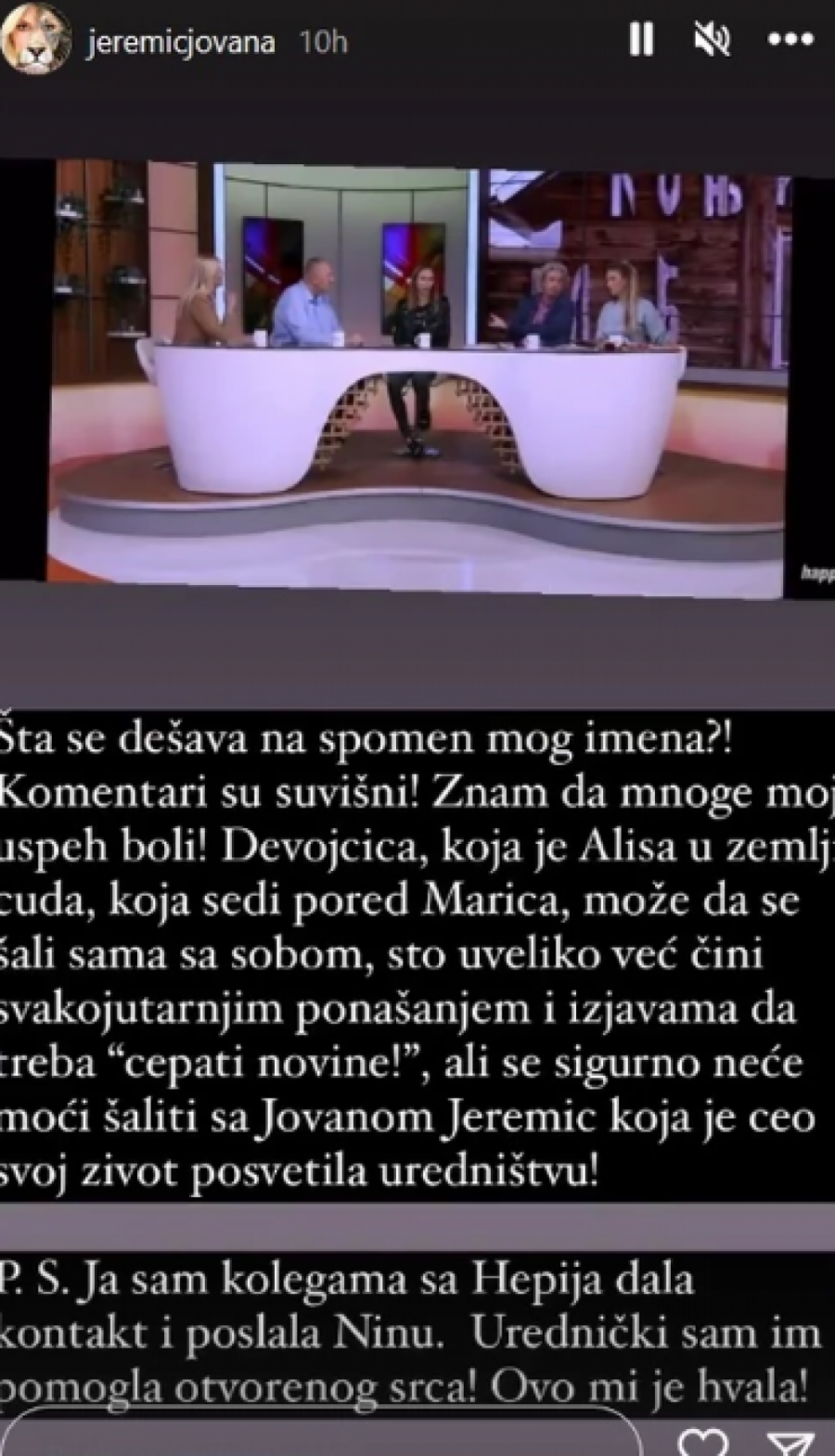 - Ja sam kolegama poslala gošću, koja je prvo kod mene gostovala i pričala o silovanju u konjičkom sportu, a kada je ona spomenula moje ime, Marić je počeo pod*ebavački da nastupa! Na to se nadovezala njegova saradnica, "Alisa u zemlji čuda", i ja to neću da dozvolim! Da moje dobro bude uzvraćeno ružnim i nekorektnim ponašanjem. Ponašanjem koje pokazuje zavist i ljubomoru prema mom uspehu, a moj postupak govori o mojoj širini, pre svega uredničkoj, jer sam im ustupila gosta nakon moje emisije. Ja volim prema takvima da ispadnem dobar čovek, čisto da se zna u čemu je razlika - započela je Jovana Jeremić za naš portal i dodala: