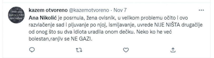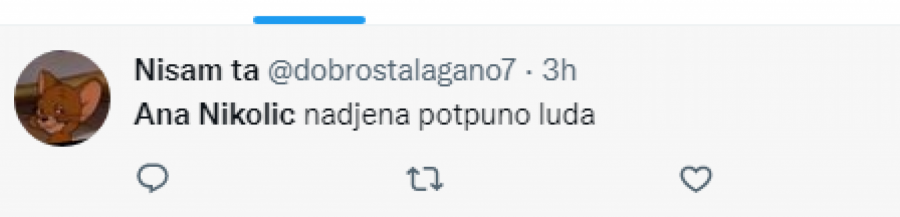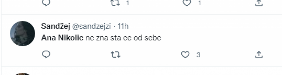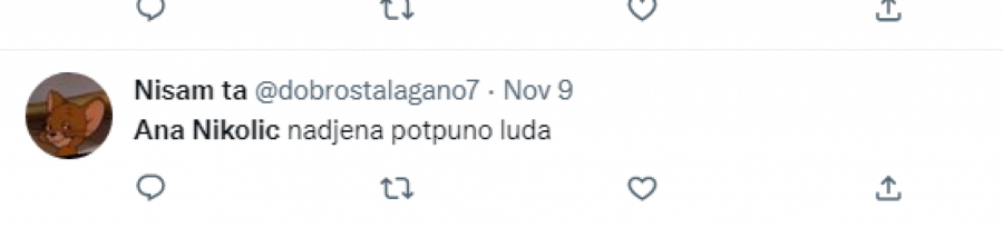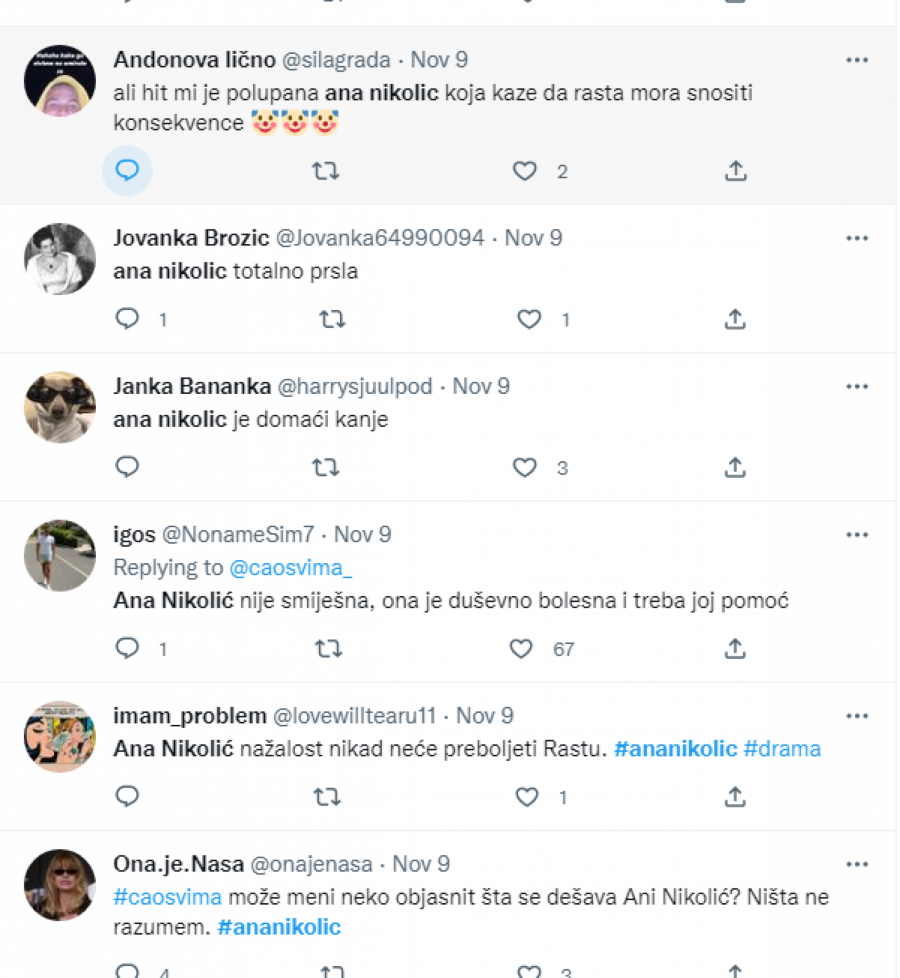"Ana Nikolić nađena potpuno luda.", "Ova žena potpuno ubija Anu Nikolić na koju sam rezala vene kao detence", "Ana Nikolić ne zna šta će od sebe", "Ali hit mi je Ana Nikolić koja kaže da će Rasta snositi konsekvence", pisali su korisnici društvenih mreža.