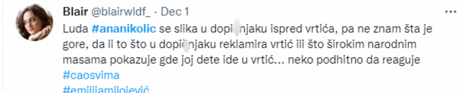 "Ana Nikolić totalno prsla", "Ana Nikolić je domaći Kanje", "Ana Nikolić nije smešna, ona je duševno bolesna i treba joj pomoć", "Ana nikada nažalost neće preboleti Rastu", "Može li mi neko objasniti šta se dešava Ani Nikolić", "Otkažimo Anu Nikolić! Dosta je reklamirala svoju sujetu, alkohol, homofobiju, nervne ispade. Ako joj nije dobro postoje ljudi koji joj mogu pomoći. Ovo nije ni gledljivo, ni slušljivo", " Luda Ana Nikolić se slika u dopi*njaku, pa ne znam šta je gore što reklamira takva vrtić ili to što širokim narodnim masama pokazuje gde joj dete ide u vrtić. Neka neko hitno reaguje", nizali su se komentari.