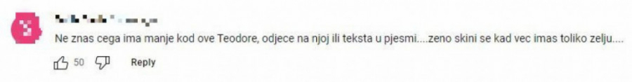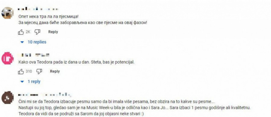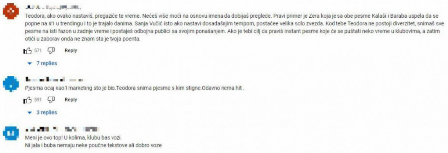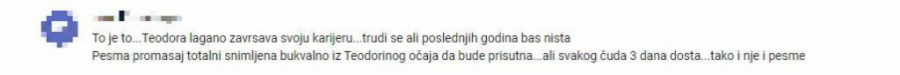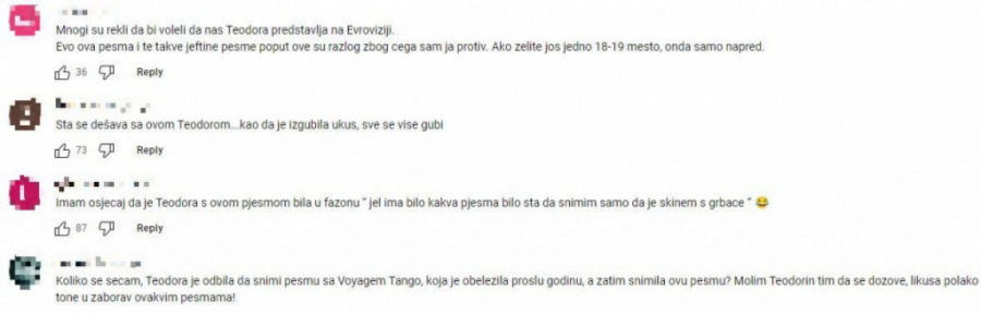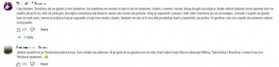 - „Opet neka tra la la pesmica. Za mesec dana biće zaboravljena kao sve pesme na ovaj fazon", „Kako ova Teodora pada iz dana u dan. Šteta, baš je potencijal”, „Postoji narodna poslovica koja bi opisala ovu pesmu: Tresla se gora, rodio se miš”, „Mnogi su rekli da bi voleli da nas Teodora predstavlja na Evroviziji. Evo ova pesma i te takve jeftine pesme poput ove su razlog zbog čega sam ja protiv. Ako želite još jedno 18-19 mesto, samo napred", „Koliko se sećam, Teodora je odbila da snimi pesmu sa Vojažem „Tango”, koja je obeležila prošlu godinu, a zatim snimila ovu pesmu? Molim Teodorin tim da se dozove, likuša polako tone u zaborav ovakvim pesmama” - bili su samo neki od komentara na račun ovog dueta.