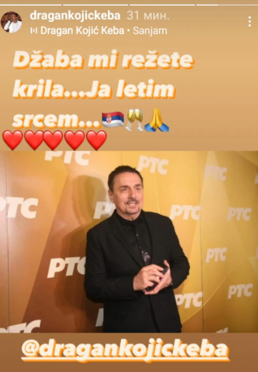 Zanimljivo je da on nije napisao kome upućuje ove reči da mu džaba režu krila, ali na društvenim mrežama ljudi su ovo shvatili kao da je Keba hteo da pošalje ovu poruku zato što je uz nju objavio svoju fotografiju na kojoj se u pozadini vidi logo Javnog servisa Srbije. Upravo po odluci žirija RTS-a Kojićeve pesme, kao i numere koje pevaju Goca Lazarevic, Ivan Milinković, Jasna Đokić i drugi folk izvođači nisu ušli u trku za predstavnike Srbije na predstojećoj Evroviziji.