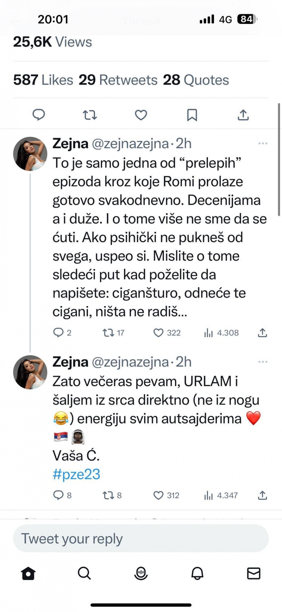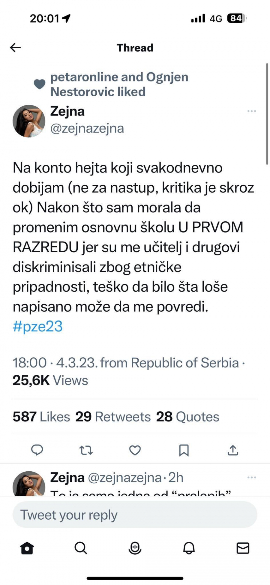 -Na konto hejta koji svakodnevno dobijam (ne za nastup, kritika je skroz okej), Nakon što sam morala da promenim osnovnu školu u prvom razredu jer su me učitelji i drugovi diskriminisali zbig etničke pripadnosti, teško da bilo šta loše napisano može da me uvredi- napisala je Zejna na svom Tviteru nalogu i dodala: