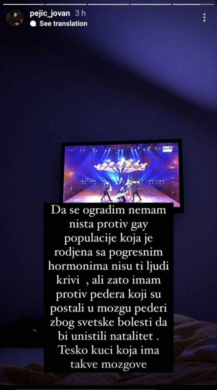 - Da se ogradim, nemam ništa protiv gej populacije, koja je rođena sa pogrešnim hormonima, nisu ti ljudi krivi. Ali zato imam protiv pe*era, koji su postali u mozgu pe*eri zbog svetske bolesti, da bi uništili natalitet. Teško kući koja ima takve mozgove - napisao je Jovan. Inače, Lukas je prvi estradni pevač koji je negativno prokomentarisao pesmu "Samo mi se spava" i našeg predstavnika Luka Bleka.