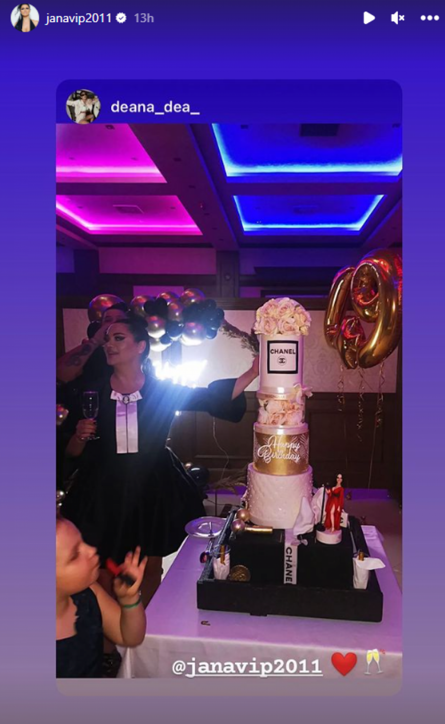 Jana je za svoje veselje obukla zanimljivu crno belu odevnu kombinaciju, a na torti sa četiri sprata je pisao naziv poznatog modnog brenda "Chanel". Kako je izgledala proslava pogledajte u video snimku iznad.