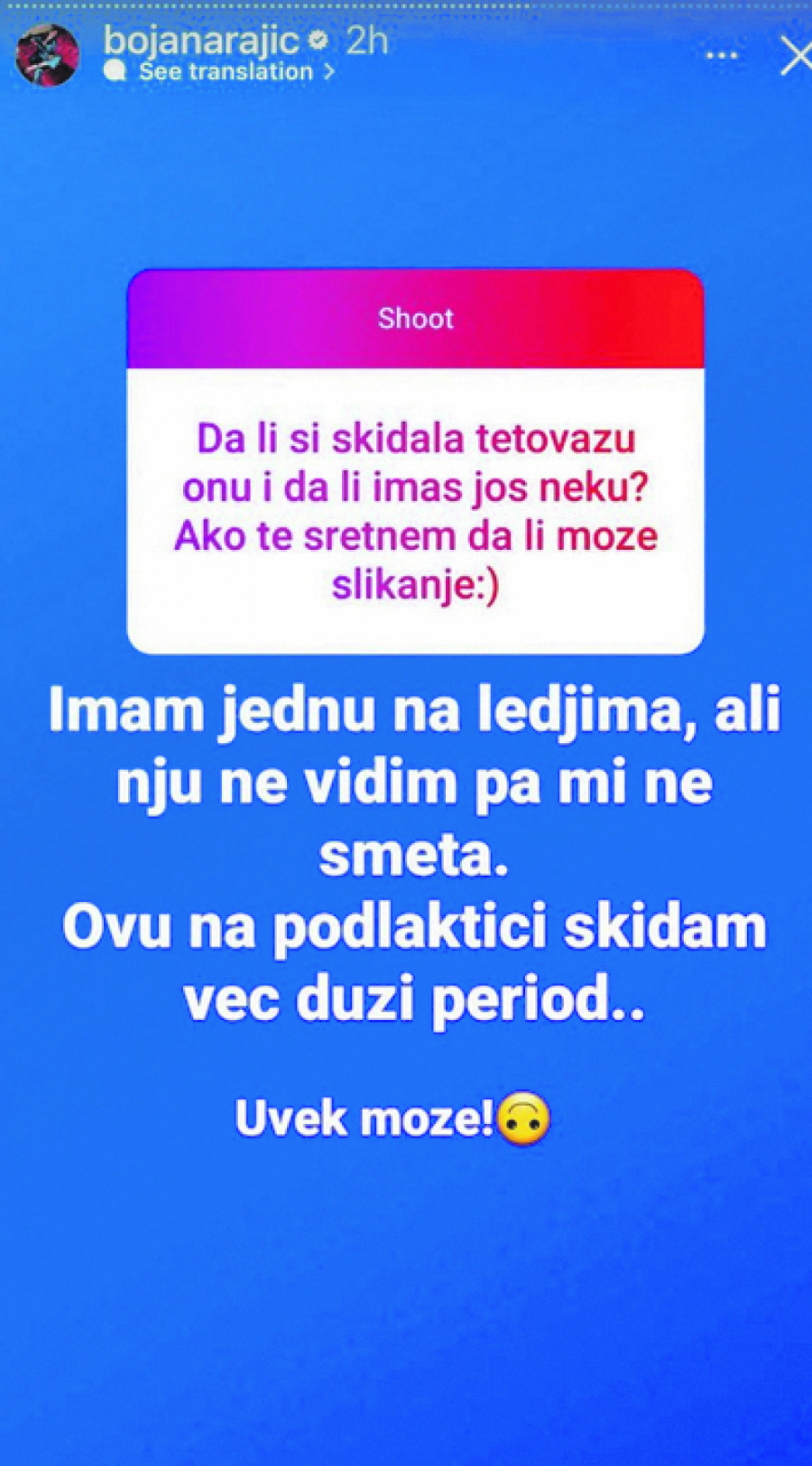 - Dugo je razmišljala o tome. Bojana se prethodnih godina u potpunosti posvetila sebi, zdravom načinu života i vraća se prirodnom izgledu. Ne želi da ima istetovirano ime bivšeg muža na ruci, ali ni veliku tetovažu na leđima, i shvatila je da je najbolja odluka da ih obe ukloni laserskim putem. Našla je studio i odabrala je vrhunskog stručnjaka koji će učiniti da obe tetovaže nestanu. Već je počela sa procesom, ali budući da je reč o velikim crtežima na leđima i na podlaktici, nije dovoljan samo jedan tretman kako bi sve izgledalo savršeno - rekao je naš izvor i otkrio da je bivša manekenka prošlost odavno ostavila iza sebe.