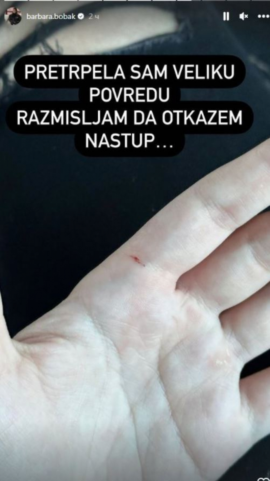 Ona je slikala svoju povređenu ruku, gde se videla mala ranica i na šaljiv način napisala kako je pretrpela ozbiljnu povredu, zbog čega razmišlja čak i da otkaže nastup.