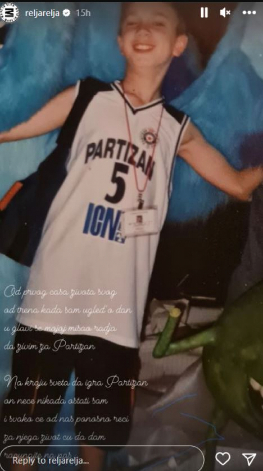 - Od prvog časa života svog od trena kada sam ogledao dan u glavi se mojoj misao rađa da živim za Partizan. Na kraju sveta da igra Partizan on neće nikada ostati sam i svako će od nas ponosno reći za njega život ću da dam, računajte na nas - napisao je Relja u opisu jedne fotografije iz detinjstva.