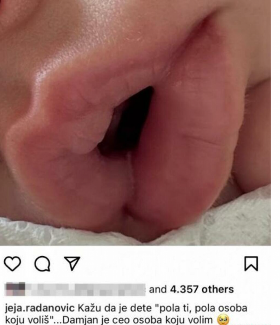 Iako ima dva sina iz prethodnog braka, trenutno najviše pažnje posvećuje Damjanu koji je nedavno došao na svet, a danas je objavila fotografiju njegovih usana i pokazala svima koliko prinova liči na njenog supruga.