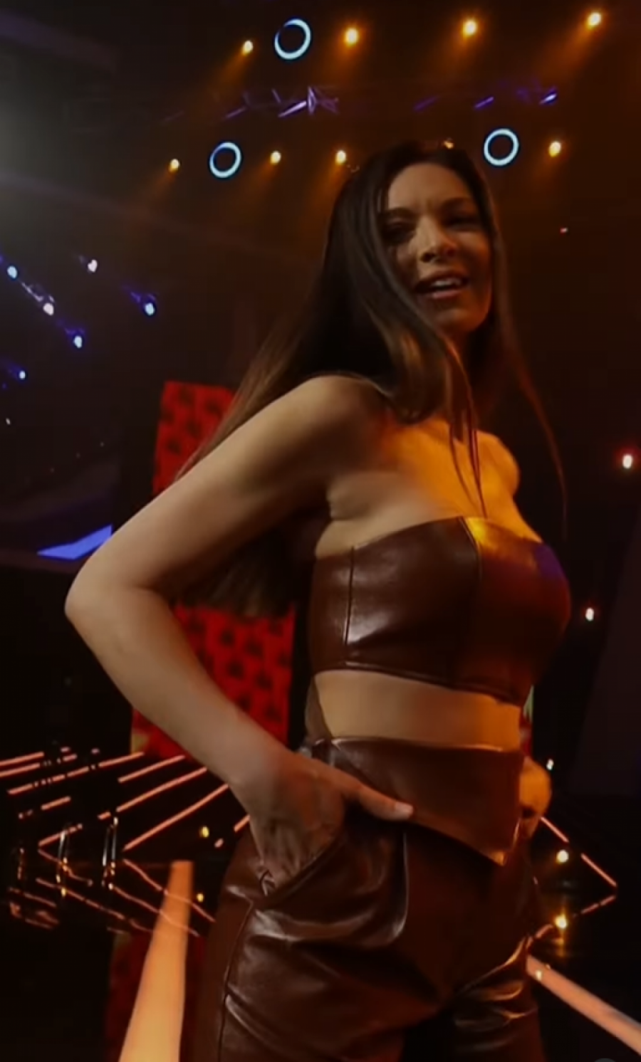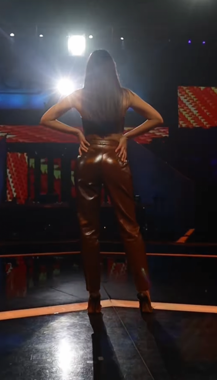 Kožni braon top i kožne pantalone u istoj nijansi bili su njen izbor, a njeno vitko telo u ovoj kombinaciji došlo je do izražaja.