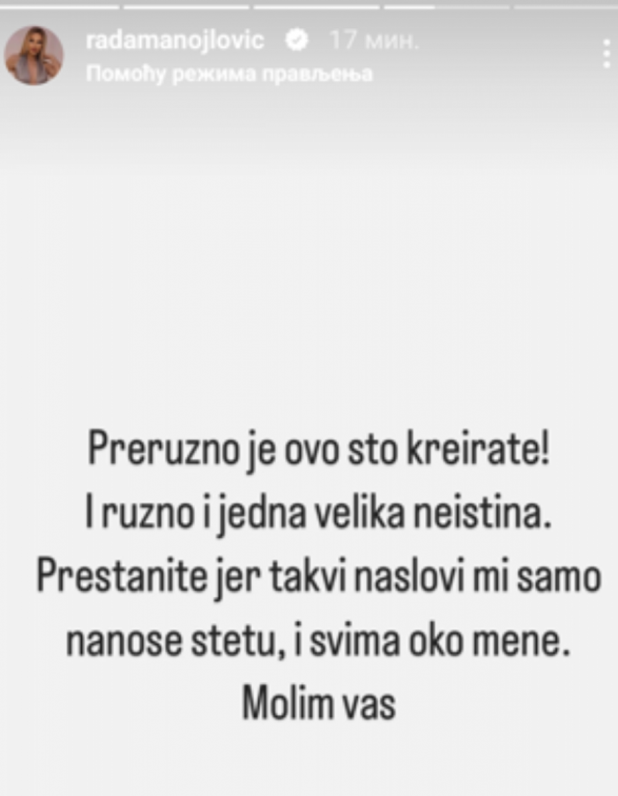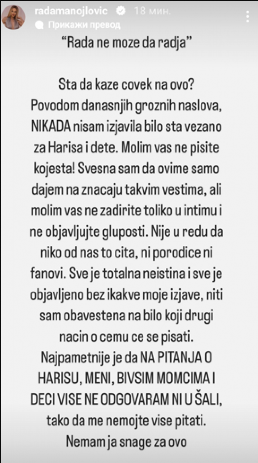 Rada je dalje u tekstu navela da više na pitanja o Harisu Berkoviću i bivšim momcima neće odgovarati upravo iz ovih razloga, a priznala je da ovakvi naslovi pogađaju i njene članove prodice.
