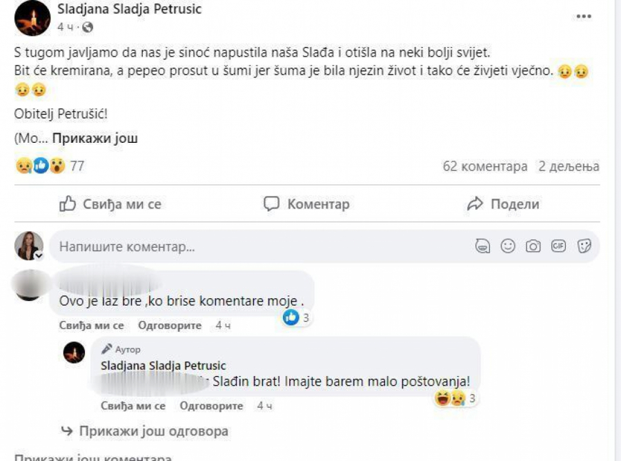 -Sa tugom obaveštavamo da nas je sinoć napustila naša Slađa i otišla u bolji svet. Ona će biti kremirana, a pepeo razvejan po šumi jer je šuma bila njen život i živeće večno. Porodica Petrušić! Molimo novinare da nam se ne javljaju jer nikada nismo bili deo javnog života, a to je bila i Slađina želja, pa da je ispoštujemo. Hvala na razumevanju!- stajalo je u objavi na njenoj društvenoj mreži.