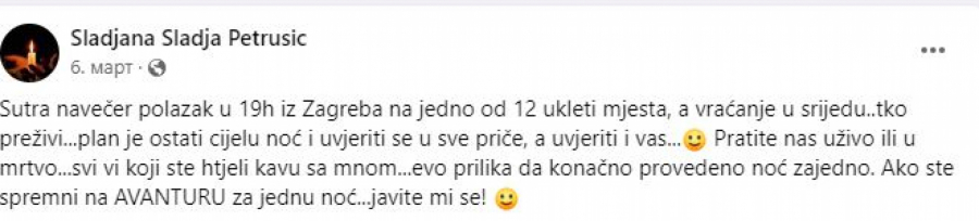 -Sa tugom obaveštavamo da nas je sinoć napustila naša Slađa i otišla u bolji svet. Ona će biti kremirana, a pepeo razvejan po šumi jer je šuma bila njen život i živeće večno. Porodica Petrušić! Molimo novinare da nam se ne javljaju jer nikada nismo bili deo javnog života, a to je bila i Slađina želja, pa da je ispoštujemo. Hvala na razumevanju!- stajalo je u objavi na Slađinom profilu.