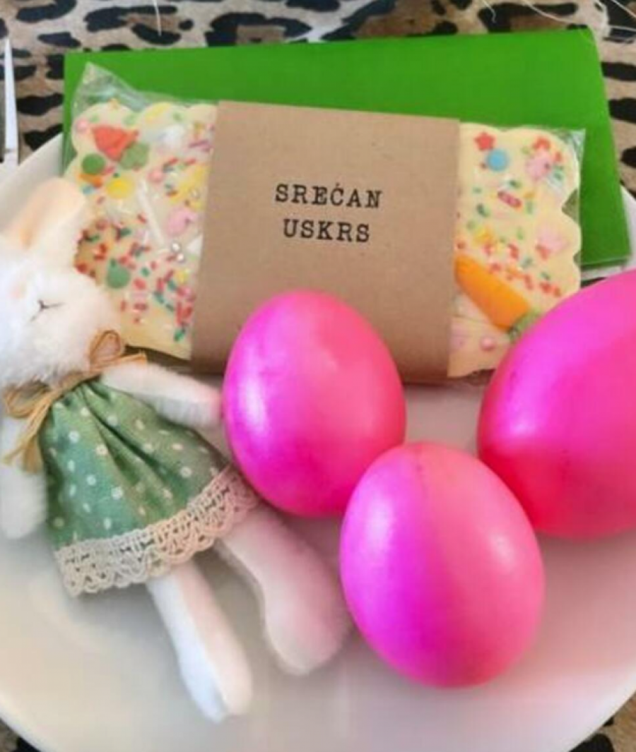 Sa druge strane je bila i nešto svedenija varijanta u roze boji sa belkim zekom i čestitkom, te se jasno vidi koliko se Jovanovićeva potrudila oko praznične atmosfere.