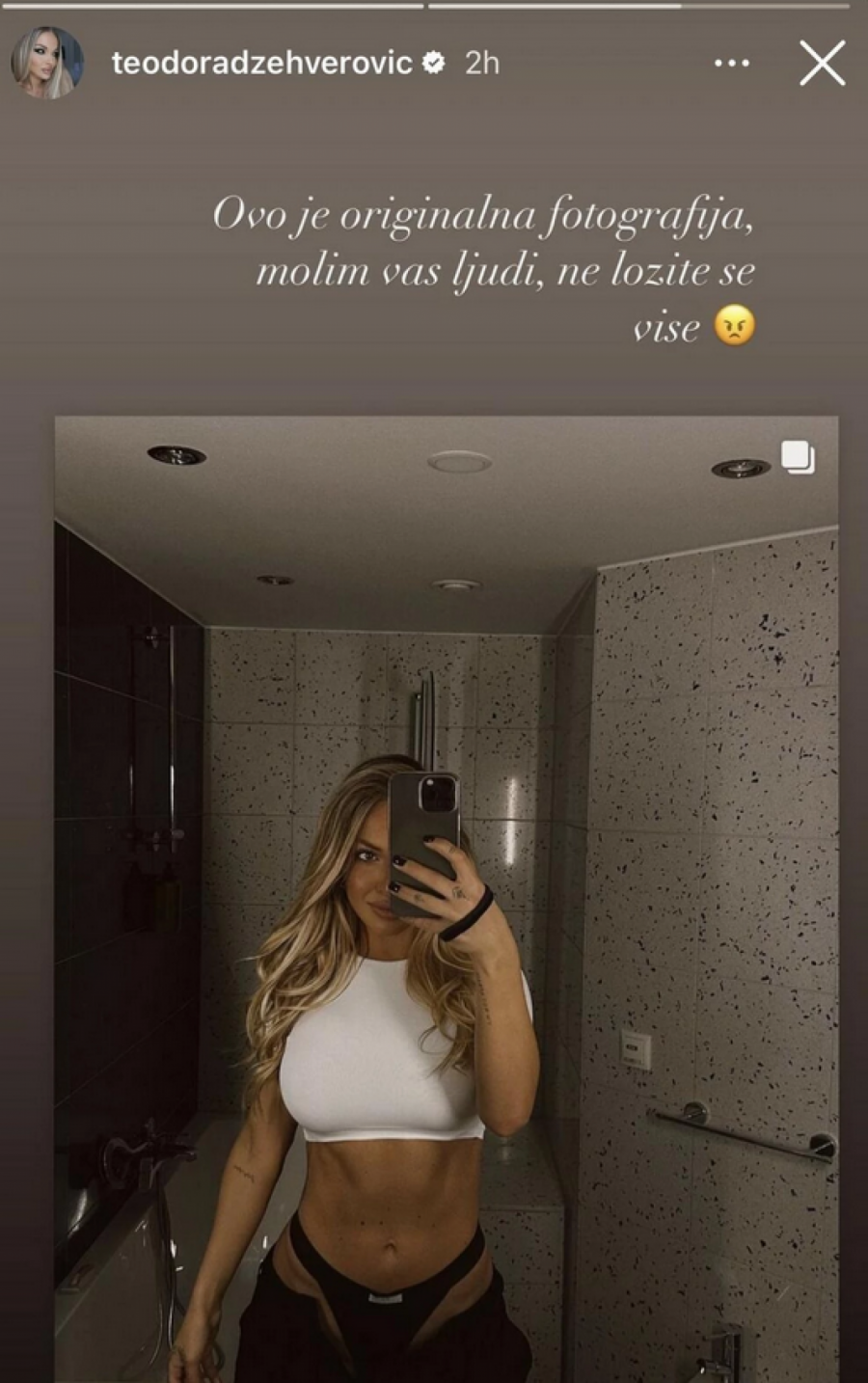 - Ovo je orginalna fotografija. Ljudi ne ložite se - napisala je Teodora uz objavu na kojoj pozira u kupatilu. Da podsetimo, nedavno je u medijima objavljena vest kako pevačicu Teodoru Džehverović navodno ucenjuju intimnim snimkom, a na društvenim mrežama kruži audio snimak intimnih odnosa.