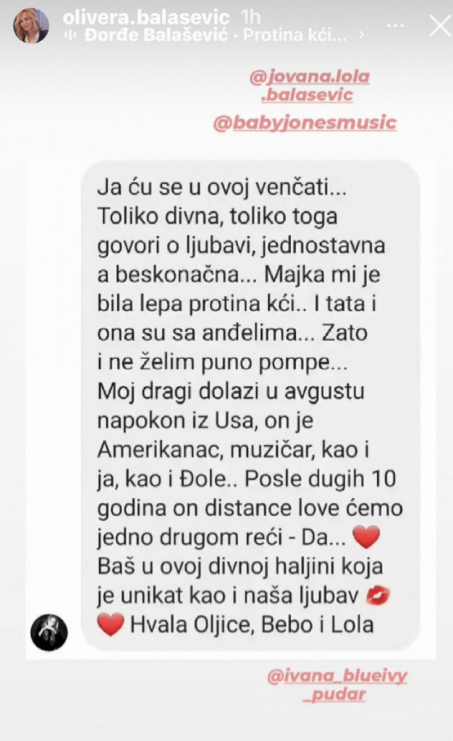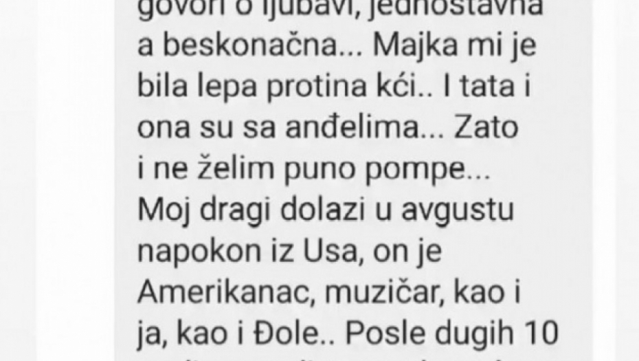 - Ja ću se u ovoj venčati...Toliko divna, toliko toga govori o ljubavi, jednostavna a beskonačna... Majka mi je bila lepa protina kći.. I tata i ona su sa anđelima, zato i ne želim puno pompe... Moj dragi dolazi u avgustu napokon iz Usa, on je Amerikanac, muzičar kao i ja, kao i Đole. Posle dugih deset godina on distance of love ćemo jedno drugom reći "da". Baš u ovoj haljini koja je unikat, kao i naša ljubav - glasila je emotivna poruka žene koja se sa mnogo zahvalnosti obratila Olji i njenim naslednicama.
