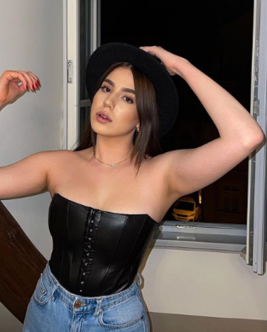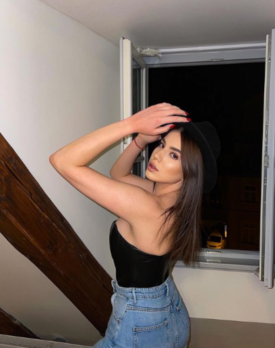 Poslednja u nizu objava je ona na kojoj izazovno pozira u farmerkama i crnom kožnom korsetu. U prvom planu su njena gola ramena i otvorena leđa, kao i grudi koje korset jedva prekriva.