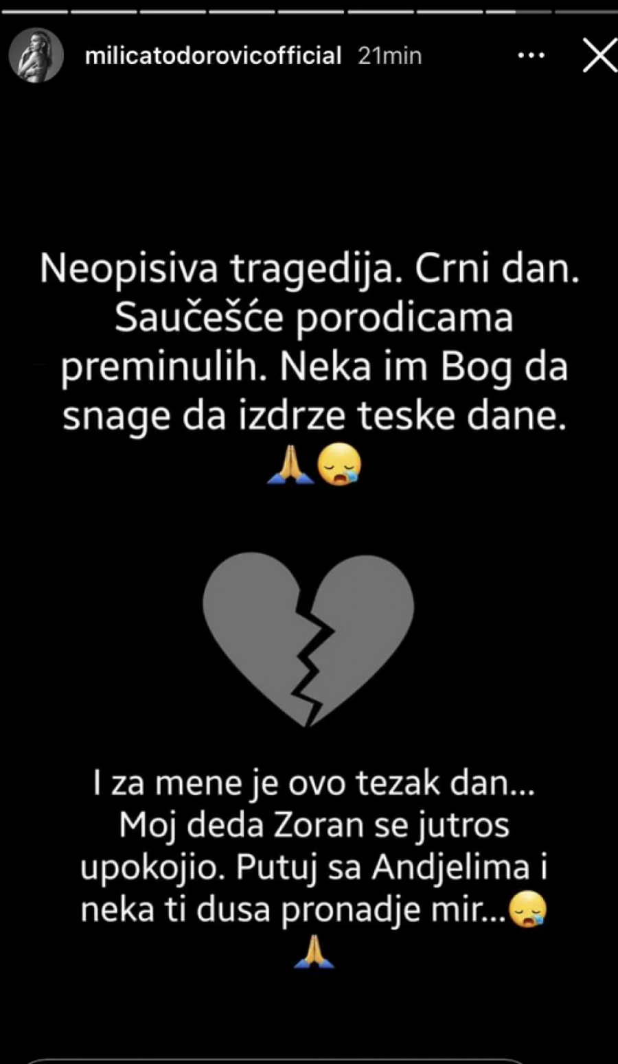–Neopisiva tragedija. Crni dan. Saučešće porodicama preminulih. Nekam im Bog da snage da izdrže teške dane. I za mene je ovo težak dan. Moj deda Zoran se jutros upokojio. Putuj sa anđelima i neka ti duša pronađe mir – napisala je pevačica i istakla da je neopisivo tužna.