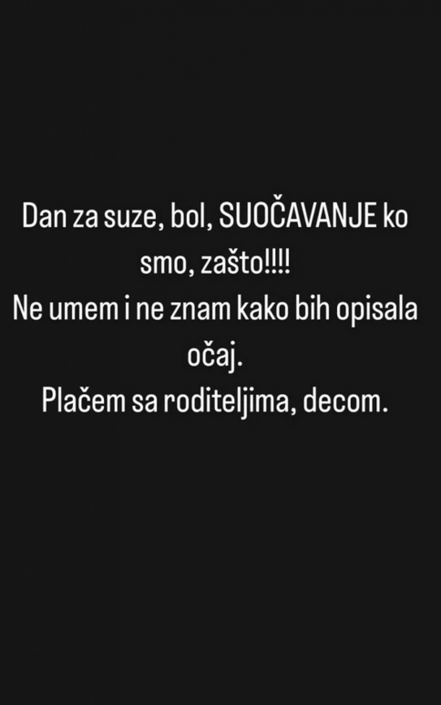 -Dan za suze, bol suočavanje ko smo, žašto. Ne umem i ne znam kako bih opisala očaj. Plačem sa roditeljima, decom – napisala je voditeljka.