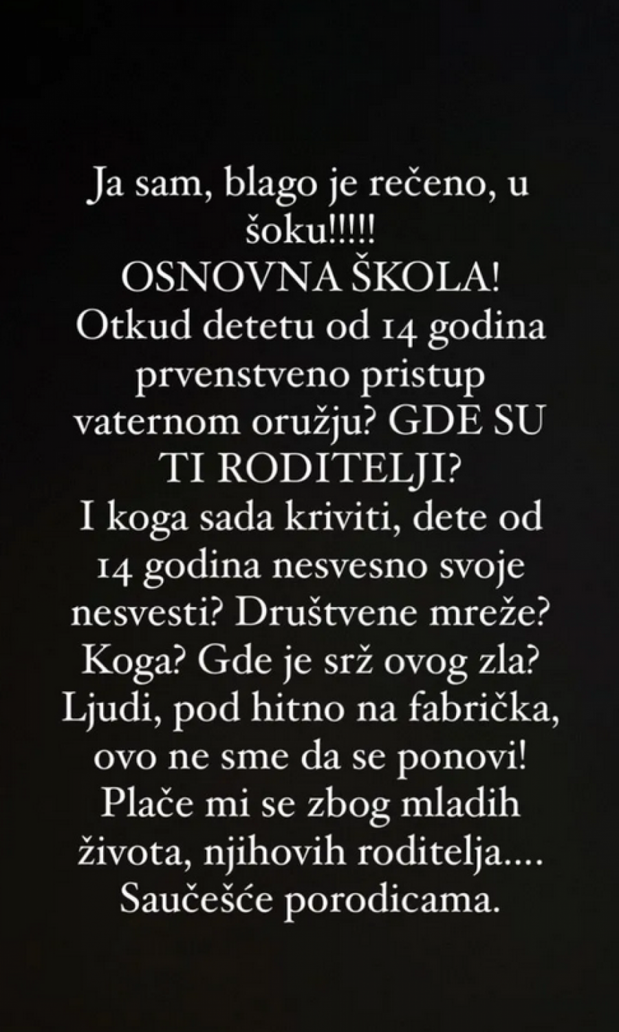 -Ja sam, blago je rečeno u šoku. Osnovna škola!! Otkud detetu od 14 godina prvenstveno pristup vatrenom oružju? Gde su ti roditelji? I koga sada kriviti, dete od 14 godina nesvesno svoje nesvesti? Društvene mreže? Koga? Gde je srž ovog zla? Ljudi, pod hitno na fabrička, ovo ne sme da se ponovi! Plače mi se zbog mladog života, njihovih roditelja. Saučešće porodicama – napisala je pevačica Sanja Vučić.