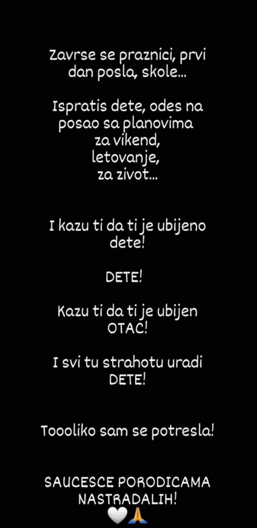 -Završe se praznici, prvi dan posla, škola… Ispratiš dete, odeš na posao sa planovima za vikend, letovanje, život… I kažu ti da ti je ubijeno dete. Dete! Kažu ti da ti je ubijen otac. I svu tu strahotu uradi dete. Toliko sam se potresla, saučešće porodicama – napisala je voditeljka.