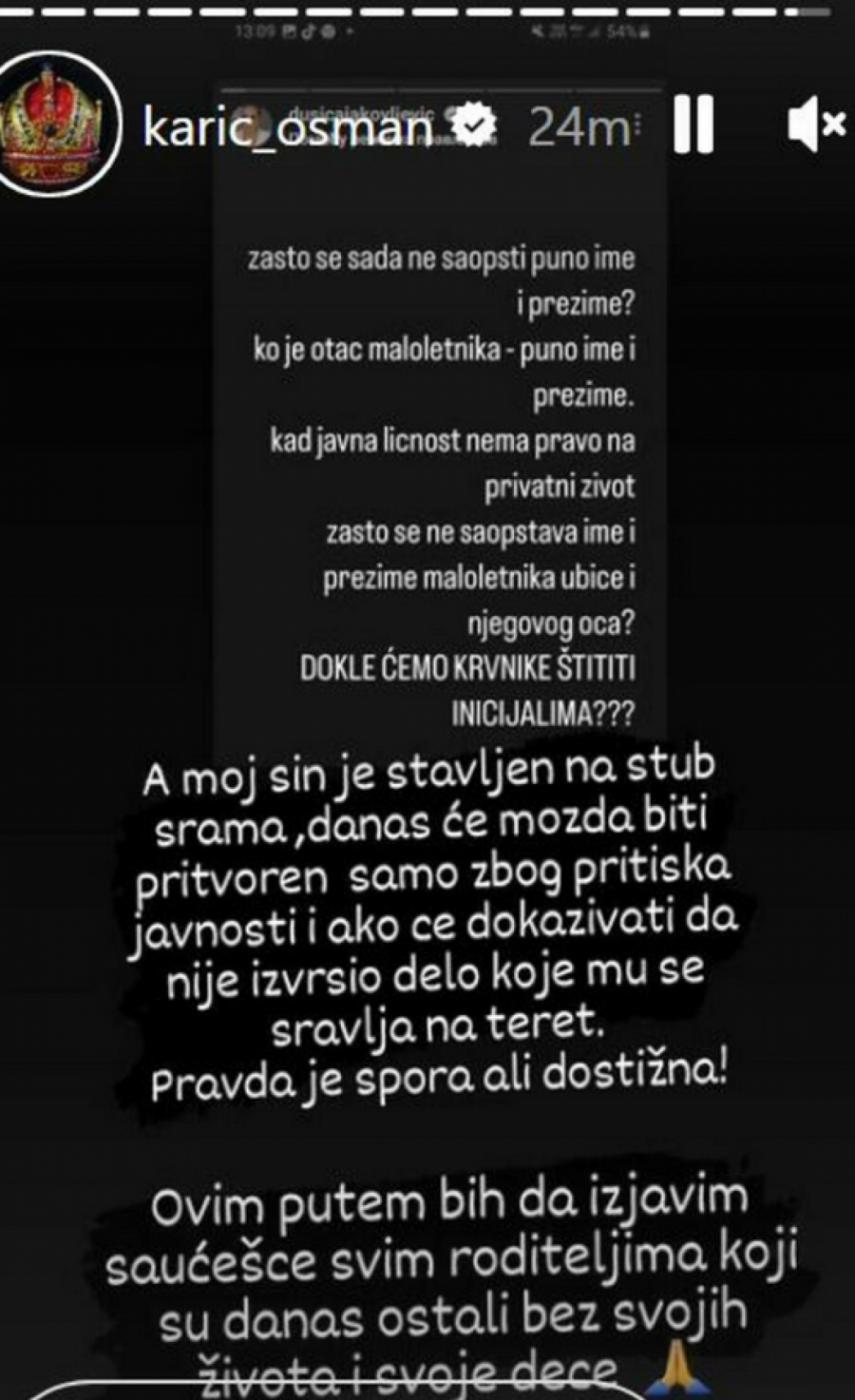 -Moj sin je stavljen na stub srama. Danas će možda biti pritvoren samo zbog pritiska javnosti iako će dokazivati da nije izvršio delo koje mu se stavlja na teret. Pravda je spora ali dostižna - napisao je Osman.