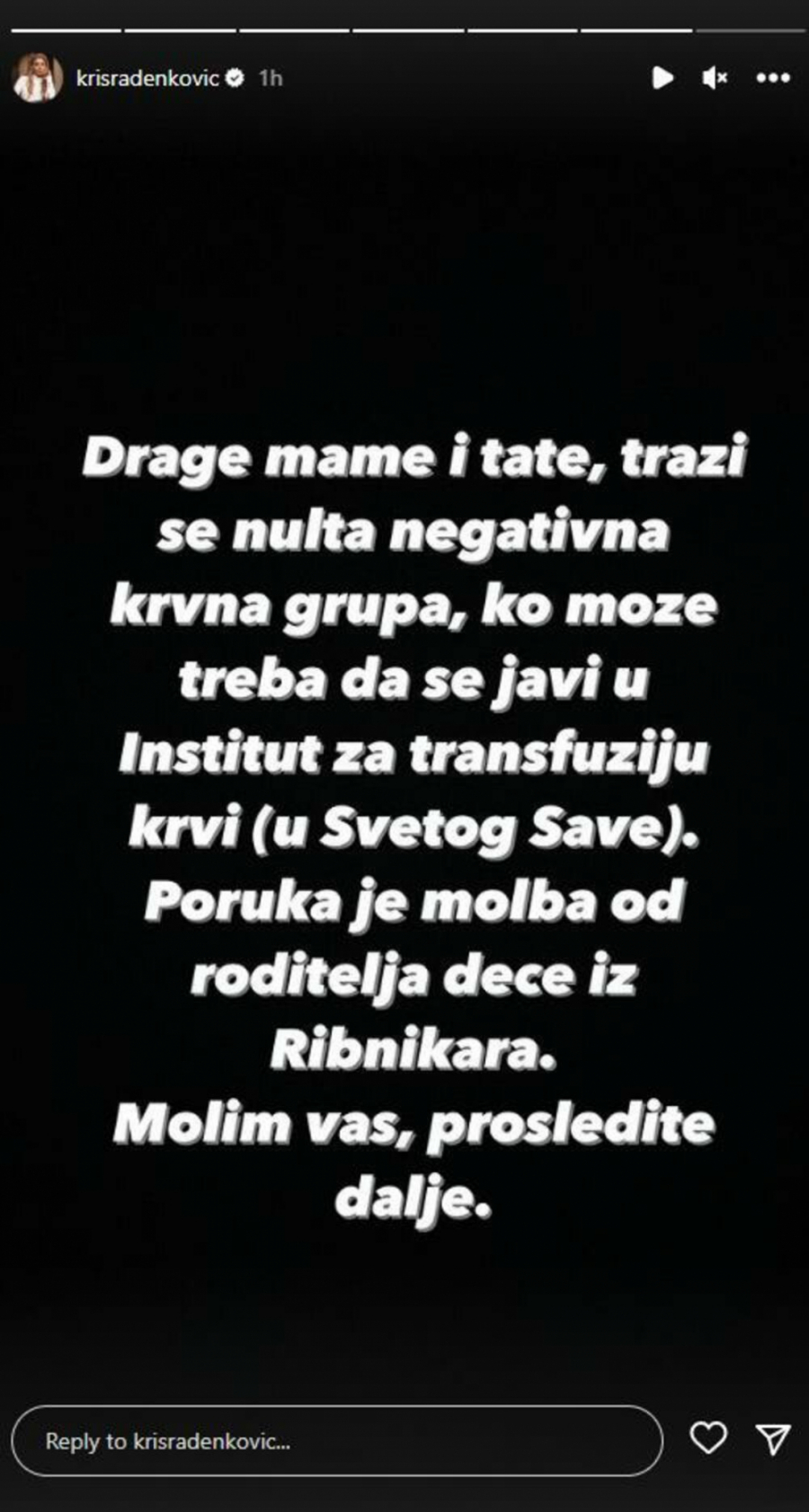 "Drage mame i tate, traži se nulta negativna krvna grupa, ko može treba da se javi u Institut za transfuziju krvi (u Svetog Save). Poruka je molba od roditelja iz Ribnikara. Molim vas, prosledite dalje", objavila je Kristina.