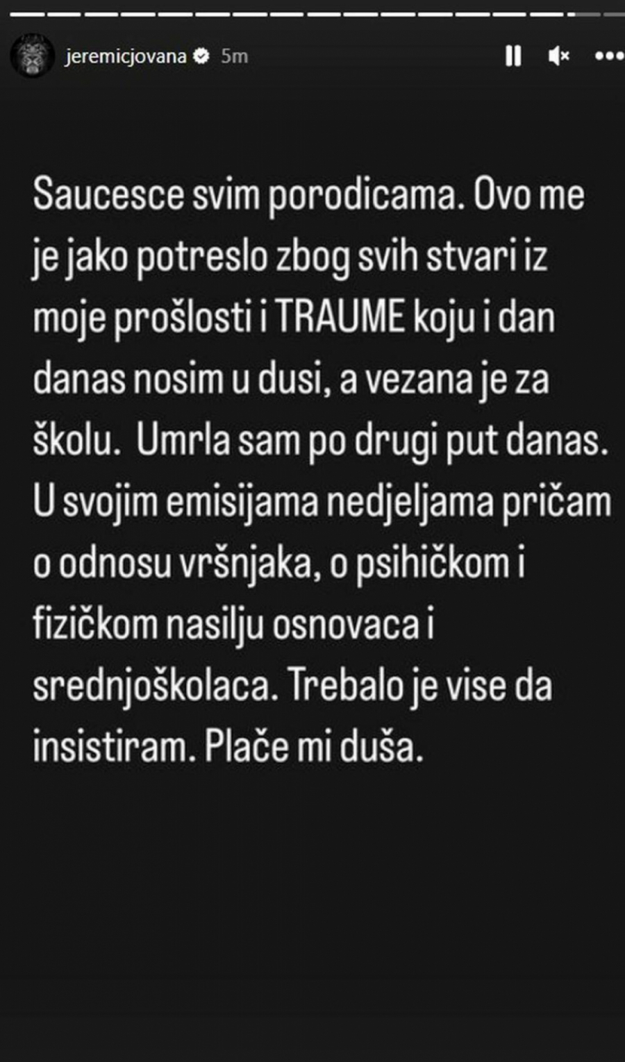- Saučešće svim porodicama. Ovo me je jako potreslo zbog svih stvari iz moje prošlosti i traume koju i dan danas nosim u duši, a vezana je za školu. Umrla sam po drugi put danas. U svojim emisijama nedjeljama pričam o odnosu vršnjaka, o psihičkom i fizičkom nasilju osnovaca i srednjoškolaca. Trebalo je vise da insistiram. Plače mi duša - napisala je ona.