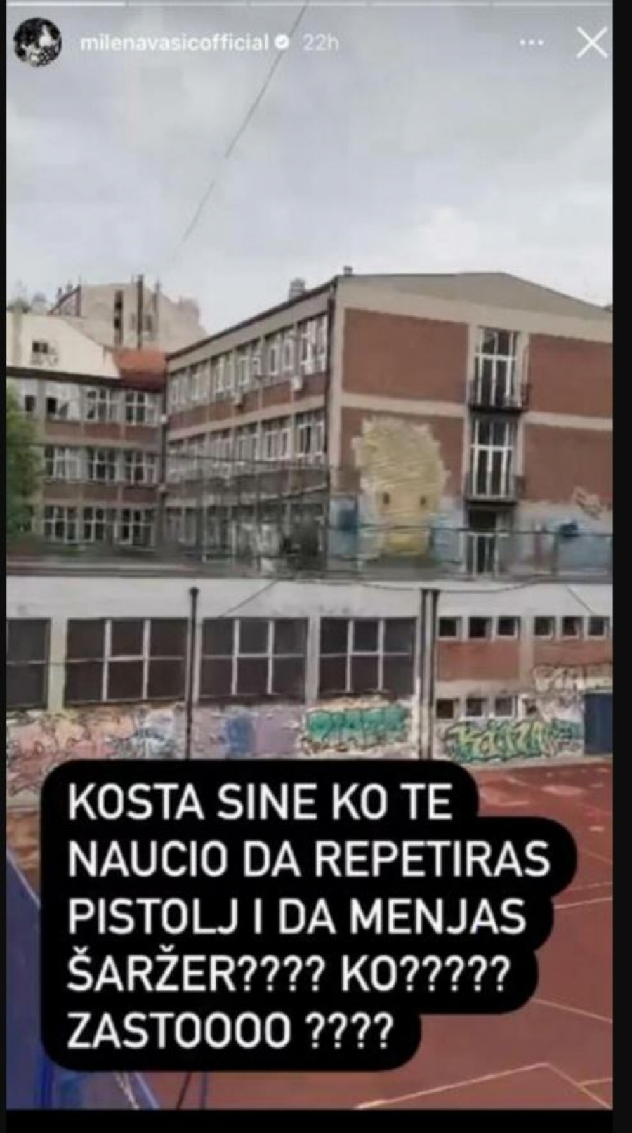 - Kosta sine, ko te je naučio da repetiraš pištolj i da menjaš šaržer? Ko? Zašto? - napisala je ona uz snimak Kostinog hapšenja, a potom se emotivnog porukom oglasila i od ubijenog dečaka, koji je nastradao pored sedam drugarica.