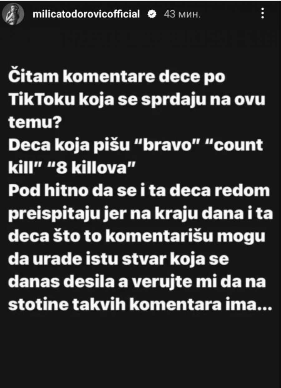 –Čitam komentare dece po TikToku koja se sprdaju na ovu temu. Deca koja pišu „bravo“, „count kill“, „8 killova“. Pod hitno da se i ta deca redom preispitaju jer na kraju dana i ta deca što to komentarišu mogu da urade istu stvar koja se danas desila, verujte mi da na stotine takvih komentara ima – istakla je.