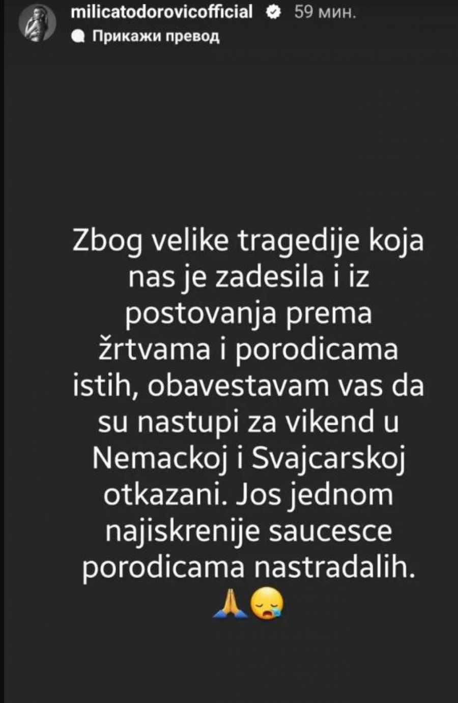 Mnogobrojni pevači su se ujedinili i otkazali predstojeće nastupe, a među njima je i Milica koja je svirku u Nemačkoj i Švajcarskoj odgodila za neki drugi vikend.