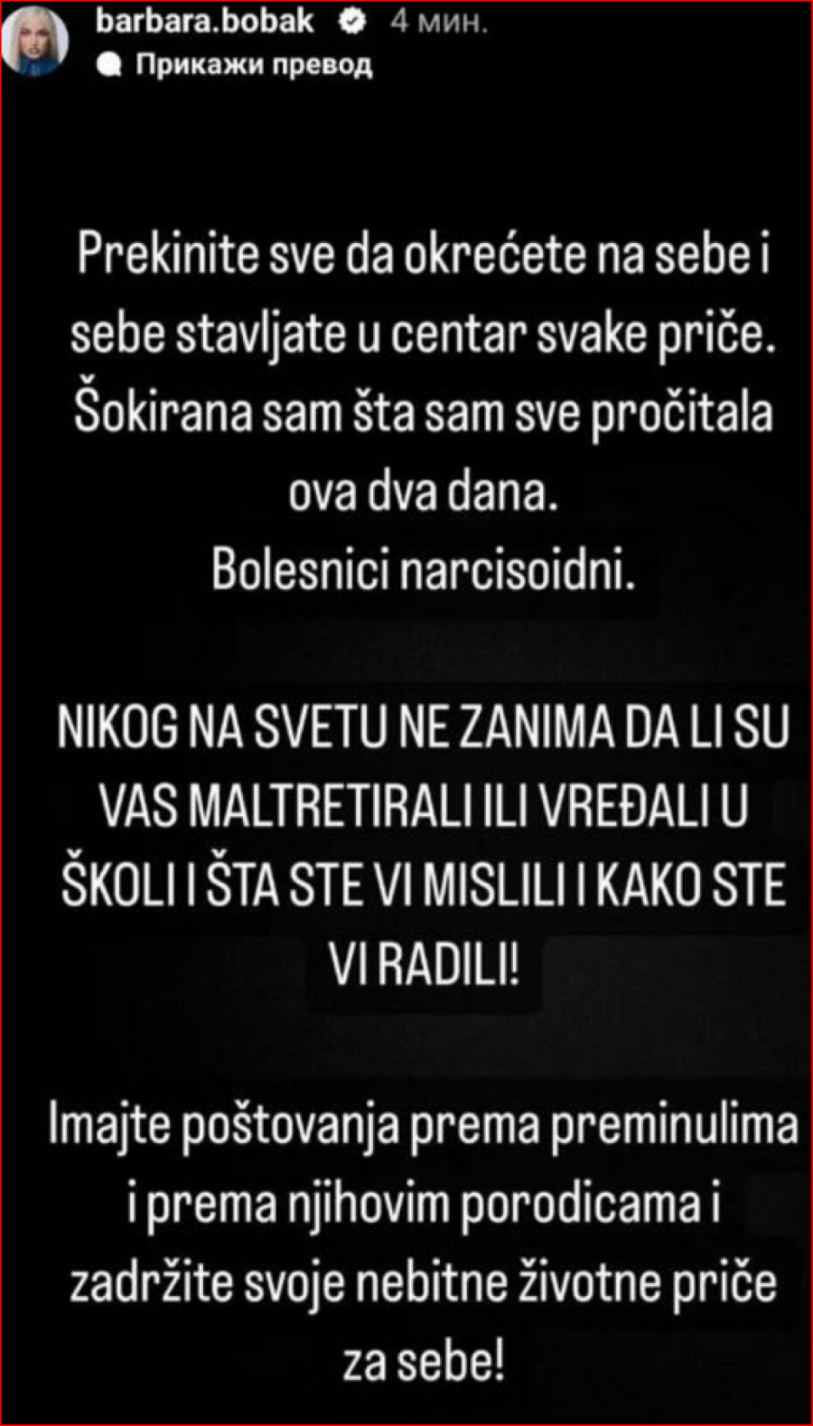 - Prestanite sve da okrećete na sebe i sebe stavljate u centar svake priče. Šokirana sam šta sam sve pročitala ova dva dana. Bolesni narcisoidni. Nikoga na svetu ne zanima da li su vas maltretirali ili vređali u školi i šta ste svi mislili i kako ste vi radili- istakla je Barbara i izjavila saučešće porodicama nastradalih, a zatim se obratila svima koji svoje priče iznose javno: