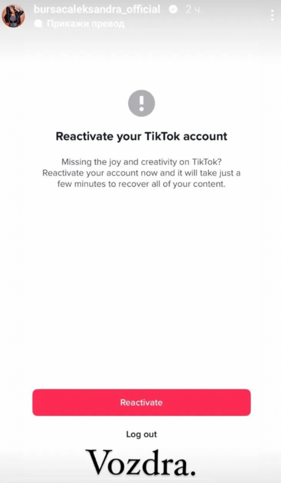 Ona je objavila fotografiju deaktiviranog naloga na popularnoj platformi i napisala: – Vozdra, što je naišlo na oduševljenje onih koji je prate.