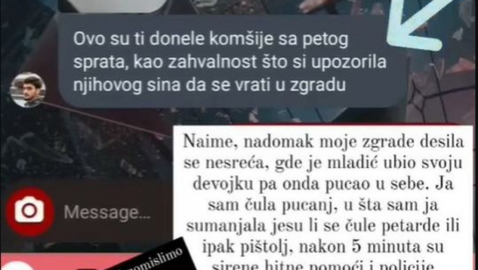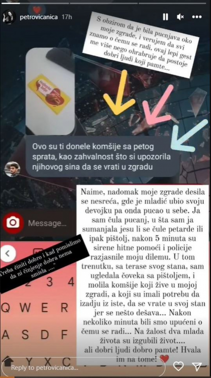 - Naime, nadomak moje zgrade desila se nesreća, gde je mladić ubio svoju devojku, pa onda pucao u sebe. Ja sam čula pucanj, u šta sam ja sumanjala jesu li se čule petarde ili ipak pištolj, nakon 5 minuta su sirene Hitne pomoći i policije razjasnile moju dilemu - započela je ona u svojoj objavi na Instagramu.