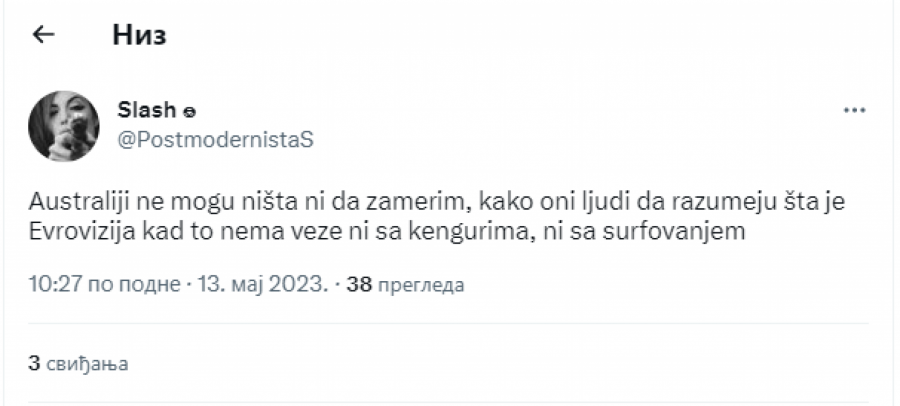 - Australiji ne mogu ništa ni da zamerim, kako oni ljudi razumeju šta je Evrovizija kada to nema veze ni sa kengurima, ni sa surfovanjem.