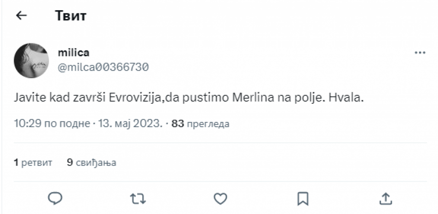 - Javite se kada završi Evrovizija, da pustimo Merlina na polje. Hvala. - glasio je jedan tvit.