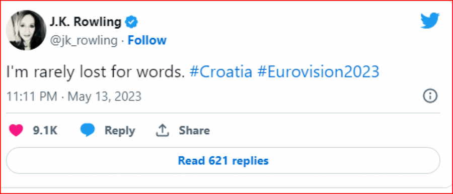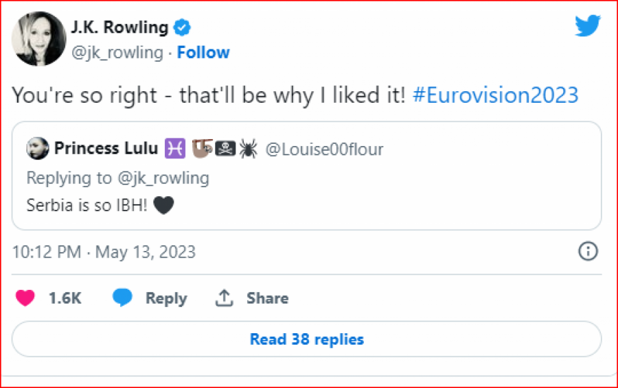 Luk Blek, predstavnik Srbije, zablistao je u finalu Pesme Evrovizije 2023. Njegov nastup podržale su mnoge slavne ličnosti, a jedna od njih je i Dž.K. Roling, autorka knjiga "Hari Poter".