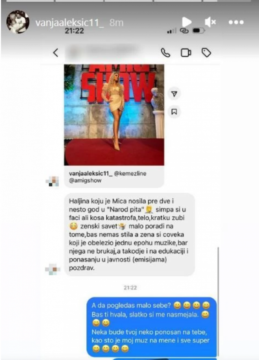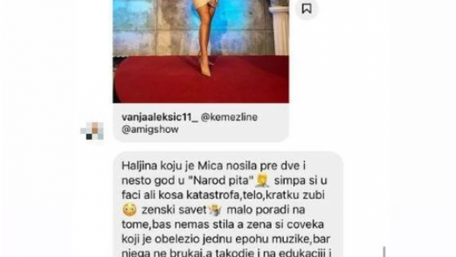 "Haljina koju je Mica (prim.aut. Milica Kemez) pre dve i nešto godine u "Narod pita". Simpa si u faci, ali kosa katastrofa, telo, kratki zubi... Ženski savet: malo poradi na tome. Baš nemaš stila, a žena si čoveka koji je obeležio jednu epohu muzike. Bar njega ne brukaj, a, takođe, i na edukaciji i ponašanju u javnosti (emisijama) (prim.aut. poradi). Pozdrav", napisala je jedna devojka Aleksićki u privatnoj poruci.